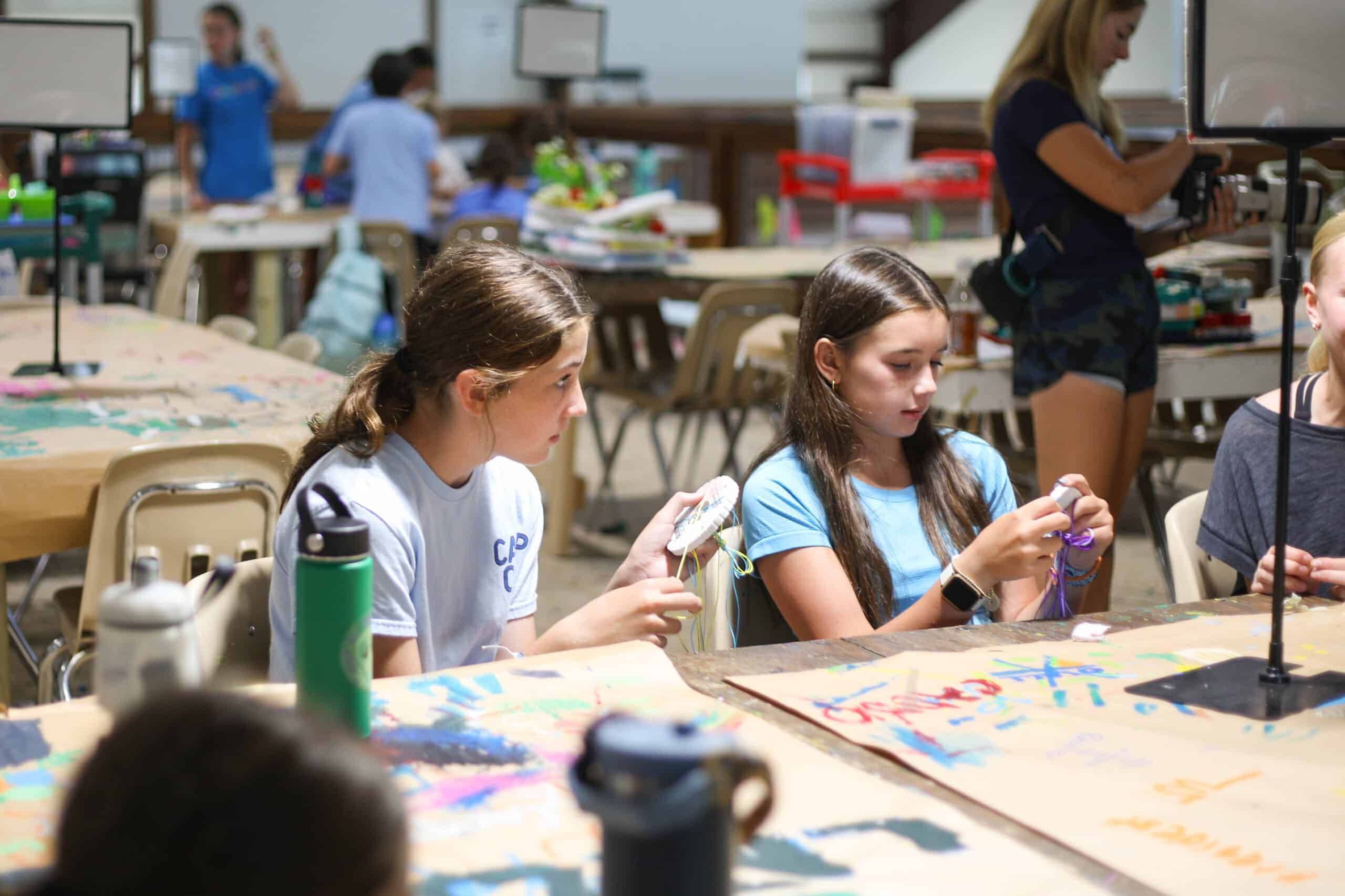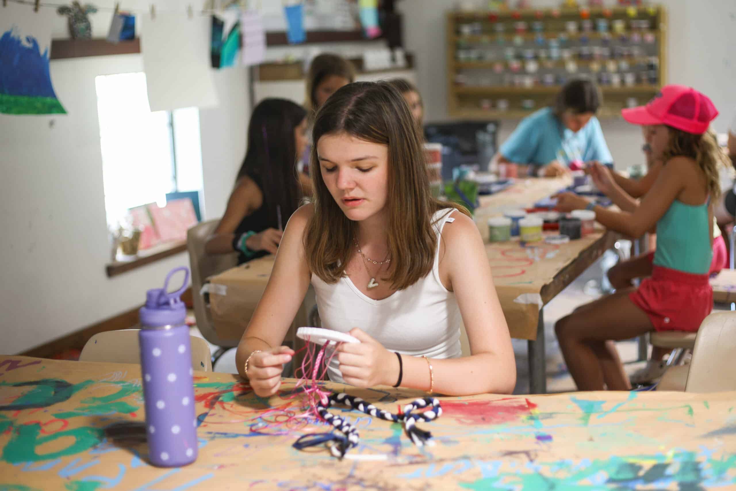 Kumihimo braiding is a form of braiding developed years ago by the Japanese. Campers use a foam disk and choice of cord to form a round or flat braided bracelet or necklace–it can be fancy or casual, thin or fat. The choices are endless and the end products are amazing!