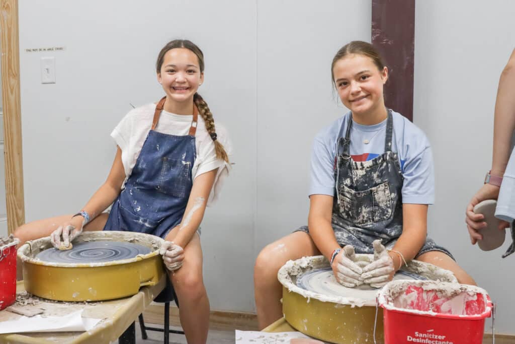 Campers are guided by experienced instructors as they learn pottery wheel techniques to throw, shape, and finish various clay pot designs.
