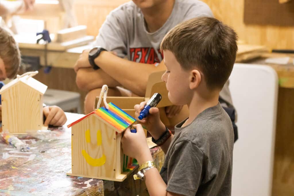 Campers learn to use plans, design their own patterns, measure, and cut the needed supplies to construct a project in the Camp OTX Woodshop.