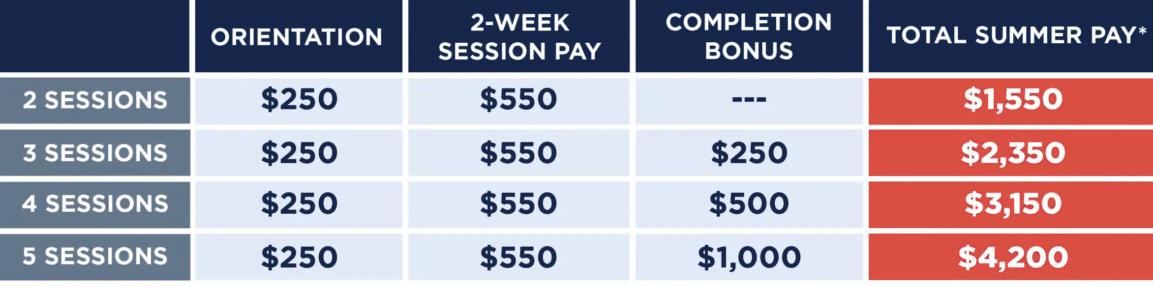 *Total Summer Pay includes a $200 bonus for Summer Staff working Session 5. Staff will receive a Completion Bonus upon completion of three or more 2-week sessions.